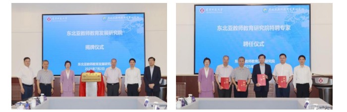 会上,副校长宁芳宣读研究院成立决定,聘任杜岩岩为首任研究院院长,刘宏书记与罗文波校长与四位专家为东北亚教师教育发展研究院成立共同揭牌。此外,研究院聘请四位专家为首批特聘研究员并为其颁发聘书。