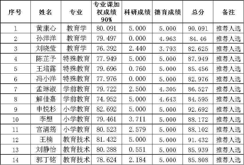 推荐免试研究生领导小组审核通过,现将推荐名单及成绩公示如下: